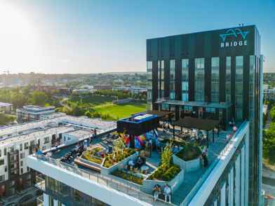 The Bridge has been designed to seamlessly move you from day to night with three perfectly appointed amenity levels. Thrive in the co-working space or tape a podcast. Let your pet run around the outdoor pet lounge. Take happy hour on the rooftop before heading out for a night on the town, or stay put and host friends to a BBQ dinner and movie night in the media room. On each floor, discover custom artwork designed by local artists just for Bridge residents.