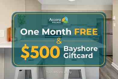 Rent Special available! Limited Time Offer: 1 Month Free PLUS $500 Shopping Spree! Sign a lease this season & get one month free PLUS a $500 Bayshore Shopping Centre gift card *. Refer a friend or family member to join our community and you’ll both receive a $250 rent credit . *Terms and Conditions: Offer only available for January and F