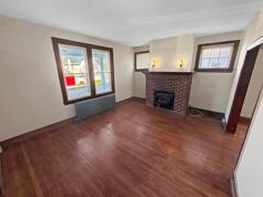 Step inside through a covered front porch into a common area with a vintage 1940s door. To the left, a quaint bedroom awaits—ideal for an office or play area. Straight ahead is the spacious living room which boasts a stunning brick fireplace and expansive windows. Continue through the layout into the formal dining area and then into the well-appointed kitchen. The kitchen features a gas range, stackable washer/dryer, refrigerator, and pantry. A hallway off the kitchen leads to two additional bedrooms and a fully renovated shared bathroom.