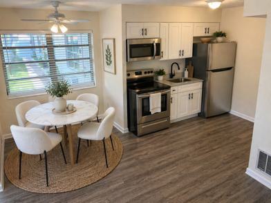 Fully remodeled 1-bedroom, 1-bath residence featuring a brand-new kitchen with stainless steel appliances, an updated modern bathroom, and wood-style vinyl flooring throughout. Equipped with central A/C and one assigned parking space. On-site laundry for added convenience.