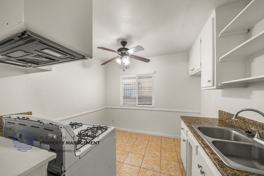 Apartments include easy-to-maintain flooring and two-tone interior paint throughout the living areas. Kitchens feature granite countertops, a gas stove, and cabinet storage for everyday cooking. Bedrooms include spacious closets and ceiling fans, while the kitchen and bathroom include tile flooring that supports a clean and functional design.