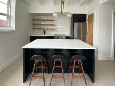 The kitchen includes a Wolf induction range, Blomberg refrigerator, large island, pantry, and white quartz countertops. Juliet Balcony off the living room. Bathroom features tiled floors and a tiled shower, as well as a stacked washer and dryer. The whitewashed cork flooring throughout offers a comfortable and flexible surface. Unique salvaged lighting is found throughout the apartment, including mid-century wall sconces from the original firehouse.