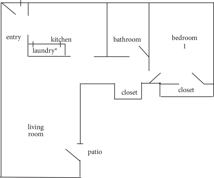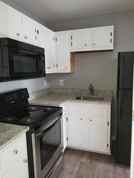This apartment has luxury/modern decor (vinyl tile and granite counter-tops) with black appliances.