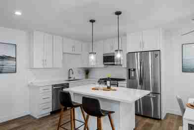 — Remodeled 1-bedroom, 1-bathroom, apartment with: Shaker white cabinets in the kitchen and bathrooms, white quartz counters, tile floors in the bathroom, stylish wood laminate floors in the living room, kitchen & bedrooms, SOAKING (DEEP) tub, STAINLESS STEEL APPLIANCES (dishwasher, range, microwave & refrigerator), WASHER and DRYER & AC in unit, fixtures and SMOOTH CEILINGS throughout!