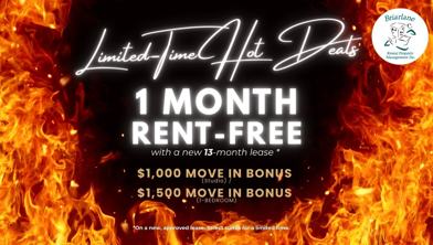 Rent Special available! ONE MONTH RENT FREE Receive your ONE MONTH RENT FREE! This limited time offer is available for new applications on select suites with a 13 month lease term. Contact our leasing agent for further details!