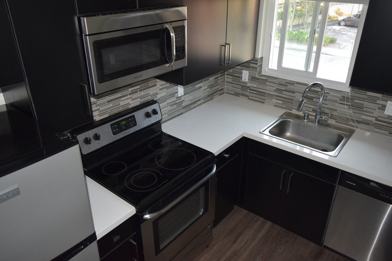 - Modern kitchen with stainless steel appliances and designer cabinets and counters