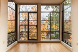This modern One Bedroom flat offers 9 ft. ceilings, wood floors, and floor-to-ceiling glass bay windows. A washer/dryer adds modern convenience and garage parking is available. Traditional details blended with modern style create superb design.