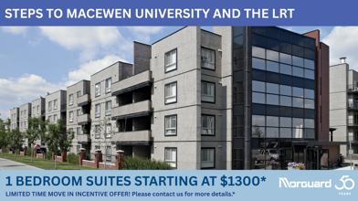 Square 104: If you are looking for space, style, and location – look no further than Square 104. With the LRT right at your doorstep, this exceptional downtown Edmonton rental is located by great restaurants, MacEwan University, shopping, and Rogers Place in the Ice District. All of our suites offer ensuite laundry, full kitchens, soaker tubs, electric fireplaces, balconies, and more! Not to mention our lovely enclosed courtyard and fitness centre. Square 104 is great for urban professionals and students.