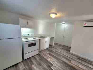 Inside the studio you will find wood-grain vinyl flooring throughout and a kitchen equipped with white cabinetry, a refrigerator, and a stove. The bathroom features a stand-up shower with a marble-design backsplash and updated fixtures that give the space a clean, modern look. Two spacious walk-in closets provide generous storage, making the studio both functional and comfortable.