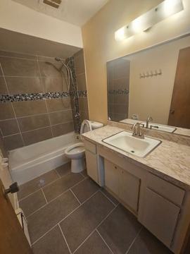 Newly tiled kitchen and bathroom with modern tile bath surround.