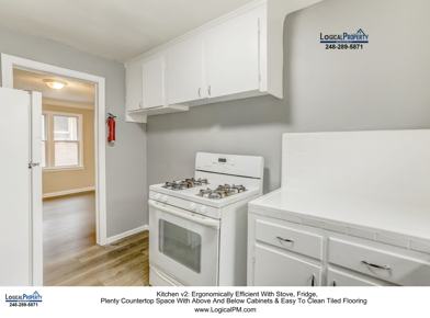 Kitchen is ergonomically efficient with stove, fridge, plenty countertop space with above and below cabinets and easy to clean tiled flooring.
