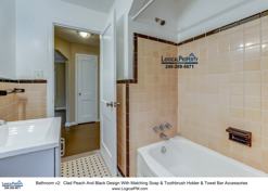 Entering through the hallway, to your left you will be delighted by the clad peach and black design of the bathroom with matching soap and toothbrush holder and towel bar accessories.