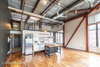 Amazing Industrial Styled Artist loft in the Da Vinci rarely available for rent on the market. This oversized loft boasts 14’10 ceilings, stunning mountain views through the floor to ceiling wall of windows, operable skylight, open concept living room, and kitchen. Absolute premium location off Main Street, steps to Olympic Village, the finest brew houses, restaurants, Emily Carr, the seawall and skytrain. In-suite laundry and 1 parking included.