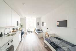 At RISE at Berkeley, our studio floor plan provides everything you need to make college life smooth. Every apartment home for rent features a kitchen equipped with appliances to accommodate your meal preparation, and air conditioning and heating ensure your comfort all year round. A stylish kitchen and wood-like flooring bestow a modern décor, and furniture options are available to help lessen your load. In-unit washer and dryer make your laundry day a breeze.