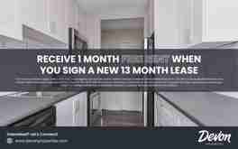 *Terms and conditions apply. Select Units Only. To be eligible, you must be a new resident and sign a lease for the specified lease term. The offer is not applicable for those who transfer within the Devon Properties portfolio. This is a one-time offer and may be withdrawn or extended at any time by Devon Properties Ltd. Offers, benefits and services are subject to change and are not an essential, required, or ancillary service provided by the Landlord.