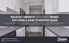 *Terms and conditions apply. To be eligible, you must be a new resident and sign a lease for the specified lease term. The offer is not applicable for those who transfer within the Devon Properties portfolio. This is a one-time offer and may be withdrawn or extended at any time by Devon Properties Ltd. Offers, benefits and services are subject to change and are not an essential, required, or ancillary service provided by the Landlord.