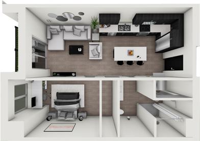This 1-bedroom, 1-bathroom apartment features large windows with downtown views, a balcony (on floors 2-6), an open floorplan, premium window coverings, luxury vinyl floors, a kitchen island, and stainless steel appliances. This apartment is wired with high-speed fiber wireless internet, keyless secure entry, central air, and a washer and dryer.