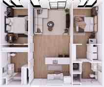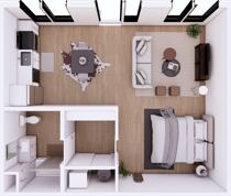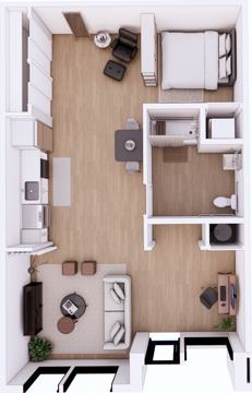 This floor plan provides a unique twist on the classic one‑bedroom. A generous living room invites you to set up a home office or entertainment space, while the fully equipped kitchen—with quartz countertops, stainless‑steel appliances and coordinated black hardware—brings a modern edge. A well‑sized bedroom with ample closet space and a stylish bath round out the interior. Enjoy easy‑care luxury vinyl wood flooring and in‑unit washer/dryer connections. Step outside to take advantage of UA Station’s spacious outdoor areas, parking, and proximity to walking trails and campus. With Dogtown’s local eateries, boutiques and cultural spots nearby, this plan is ideal for those wanting a balanced lifestyle.