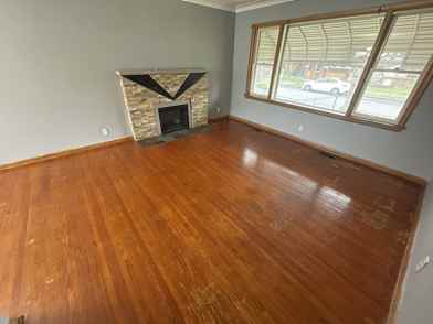 The living room showcases a stone fireplace, creating a cozy and inviting ambiance for relaxation and entertainment.