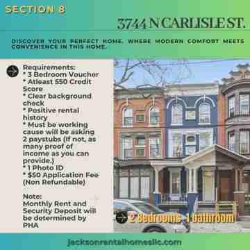 Discover the perfect blend of comfort and convenience at 3744 N Carlisle St., a beautifully renovated 2-bedroom, 1-bathroom duplex that's ready to welcome you home. Step inside and be greeted by the warmth of hardwood floors and the glow of natural light filling every corner. The spacious layout and nice-sized rooms offer plenty of space to relax and make your own. The modern kitchen features stainless steel appliances, sleek finishes, and recessed lighting that creates a fresh, inviting atmosphere. The tiled bathroom comes with a comfortable tub—ideal for unwinding after a long day. Enjoy the convenience of an in-unit washer and dryer in the basement and rear yard access, perfect for outdoor gatherings or simply enjoying a breath of fresh air. This home also features a welcoming front porch, adding a touch of classic Philly charm. Located just a few blocks from Grover Cleveland Elementary School and Lewis Katz School of Medicine at Temple University, it's ideal for families, students, or professionals alike. Section 8 is welcome, and the property's modern updates and prime location make it an excellent choice for those seeking both value and style. Schedule a visit and see why 3744 N Carlisle St. feels just like home! Section 8 Requirements * 2 bedroom voucher * Atleast 550 Credit Score * Clear background check * Positive rental history * Must be working cause will be asking 2 paystubs (If not, as many proof of income as you can provide.) * 1 Photo ID * $4.99 Application Fee (Non Refundable) Note: Monthly Rent and Security Deposit will be determined by PHA