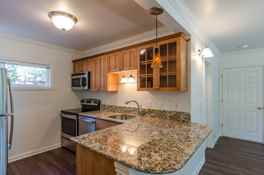 LOCATION! LOCATION! LOCATION! Walk to everything in Downtown Kirkland. This 8 plex apartment is a remodeled corner 2 bed 1 bath unit on the 2nd floor with a large sunny patio overlooking immaculately maintained grounds. Vinyl wood plank flooring throughout main living areas with carpet in the bedroom only. Kitchen features granite counter tops, stainless appliances with self cleaning oven with glass cooktop, microwave, frost free refrigerator with ice maker, dishwasher. Well-maintained coin operated washer and dryer just outside your door- shared with three other units. Reserved off street parking. Sorry, NO PETS OR SMOKING.