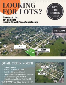 Where Comfort Meets Community - Welcome to Quail Creek North, a charming mobile home community, that offers the perfect blend of comfort, convenience, and community spirit. Nestled in a serene location, Quail Creek North is the ideal place to put down roots and call home. With a variety of available options, we have a lot that suits your needs. Our affordable leasing options start at just $450 per month, with water, sewer, and electricity hook-up included. Whether you're looking for a cozy space for yourself or a spacious lot for your family, Quail Creek North has something for everyone. Embrace the opportunity to lease a lot in our community and create lasting memories. Come and discover the inviting atmosphere and affordability of Quail Creek North today!