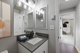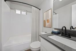 - Renovated Bathroom: A fully renovated bathroom featuring a full bathtub and a spacious vanity.