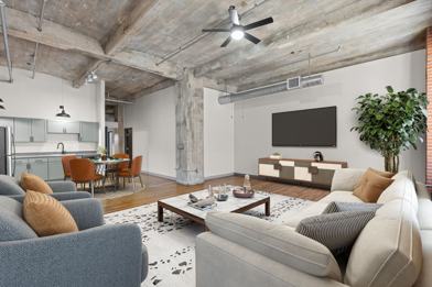 The living room is the highlight of the unit, featuring oversized windows that bring in great natural light and plenty of room for a full seating setup, dining table, and additional flex space. Exposed concrete ceilings, original columns, and hardwood floors give the loft its authentic character while keeping the space open and inviting.