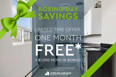 Boxing Day Savings | Enjoy One Month FREE on a 13-Month Lease + $1,000 Move-In Bonus!* (Select Suites Only)