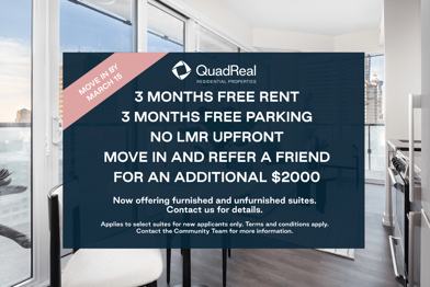 Rent Special available! 3 Months Free Rent Applies to select suites for new applicants only. Terms and conditions apply. Contact the Community Team for more information.