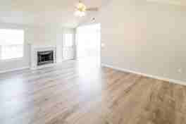 Inside, the main living area opens with light-toned LVP flooring and freshly painted interior walls, creating a bright and cohesive feel throughout the home. The living room features vaulted ceilings and a warm centerpiece, offering both visual character and a cozy focal point. Natural light flows in through large windows, enhancing the open feel of the space while maintaining an easy connection to the adjacent dining area.