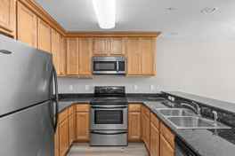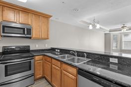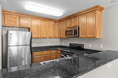 -Modern Kitchen with granite countertops, stainless steel appliances, and a convenient breakfast bar.
