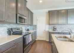 The brick-front exterior and rear-facing 2-car garage provide both curb appeal and functionality. Inside, dark hardwood flooring spans the entire main level, leading into an open-concept living space designed for comfort and entertaining. The kitchen features granite countertops, a large island, tiled backsplash, and clear sightlines into the dining and living areas. Coffered ceilings and a fireplace add architectural character and warmth to the main living space.
