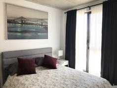 Large bedroom with queen size bed and double closet with shelves and rails. Bright and spacious living and dining room complete with couch (folds out into a queen bed), coffee table, tv stand, tv, kitchen table and chairs. Balcony.