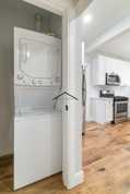 Step into this beautifully renovated home featuring an open-concept kitchen and living area with stylish, custom cabinetry, stainless steel appliances, and LED light fixtures. Hardwood floors run throughout, complemented by central air-conditioning and in-unit laundry for ultimate convenience.