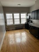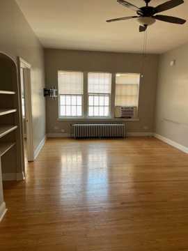 Interior features hardwood floors, ceiling fans, radiator heat, dining area, large windows, sizable bedrooms, and closet space.