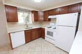 The full kitchen comes equipped with a stove, fridge, and dishwasher, brand new quartz countertops, and warm wood cabinetry.