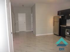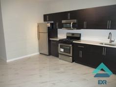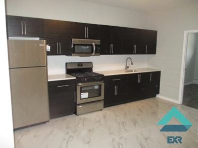 Big Eat-in-kitchen with tiled floor. Stainless appliances. Microwave.