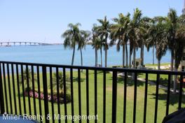 Amazing Waterfront Views Furnished Annual 2/2 Bahia Del Mar - By far one of the best picturesque waterfront views from this fully furnished and updated Two Bedroom, Two Bathroom condo at Bahia Pointe, Isla Del Sol. ANNUAL FURNISHED UNIT. Assigned covered parking on first level, take the stairs to 3rd floor entry and be prepared to be WOWED! Beautiful new kitchen, lovely open floor plan with tile flooring throughout dining/living area with 108" reclining leather couch, covered balcony overlooking the most scenic view of palm trees and waterfront! Outdoor small storage area. Primary Bedroom has a large picture window wrapping around to corner balcony for simply stunning views to wake up to in the morning! Queen size Sealy adjustable mattress w/remote control on an espresso finished sleigh bed and matching dresser/nightstand. Updated en suite bathroom with marble vanity, tub/shower combo. Walk-in closet. Bedroom #2 has Queen bed, espresso dresser and nightstand. Lovely view of the pond/fountain and palm trees. Hall bath all updated with marble vanity and tub/shower combo. Washer-Dryer mini stack in unit. New AC 2020. Unit comes with kitchen utensils/dishes, etc. Initial bedding/towels provided; tenants are encouraged to bring their own for their own desired style. Water/Sewer/Garbage/Ext. Cable/Internet/WiFi included. Tenant pays electricity. Lovely clubhouse with fitness, club room, waterfront dock, heated pool & spa for your use. AVAILABLE JULY 1, 2022!