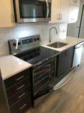 Includes upgraded stainless steel appliances, mirrored closet doors, quartz countertops, island feature with storage and outlet, extra storage due to position in building