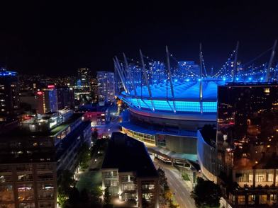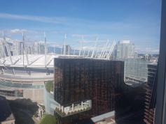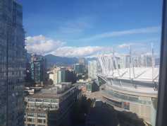 Stunning north facing mountain & city views & stadium from this well appointed 2 bedroom home. This unique floor plan boasts extra high ceilings, offers tons of light and no wasted space. Large balcony is accessible from both the living room & the master bdrm - the perfect space to enjoy the spectacular view with a cup of coffee. You can see fireworks of new year from balcony as they it will be moved to science world. Kitchen boasts Corrine countertops, gas range, microwave hood fan & dishwasher. Very well maintained. Gorgeous white cabinets & quartz stone countertops. The amenities include fitness center, swimming pool, hot tub, sauna, steam room, party room, visitor parking & access to 24 hrs concierge. Comes complete with 1 big storage locker. Parking stall is another 100$ per month (It is a big stall that fit a truck).