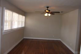 Bedroom 2: : Large bedroom with wood floors, fan with light kit and large windows with blinds