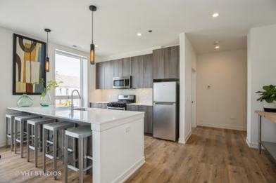 This is the one! Spectacular new construction 4 story elevator building! 1, 2 and 3 bedroom floor plans w/ condo quality finishes! This TOP floor unit features: stainless appliances, quartz counters, made in Chicago sleek cabinetry, Grohe, Kohler & Toto plumbing fixtures, in unit washer/dryer, garbage disposal, tile back splash & under cabinet lighting. Bonus office nooks, TV wall/cable outlets in bedrooms & living room, custom walk in closets, front entry closet & LED lighting thru out. Concrete soundproofing between floors & Butterfly mobile/keyless entry system. European floor to ceiling windows w/ custom roller shades and black out roller shades in bedrooms. Located on a corner adjacent to a park w/ easy access to 90/94, downtown & 312 River Run. Select units have balconies and unobstructed views of the city and park. Unit #202 features a private 20x20 deck. Indoor heated garage parking available w/ electric car charging