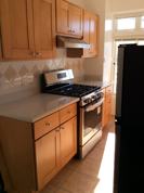 Stainless steel refrigerator and 5 burner gas range, quartz countertop, new cabinets.