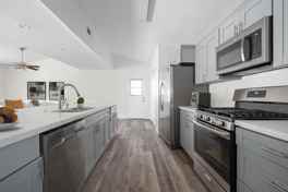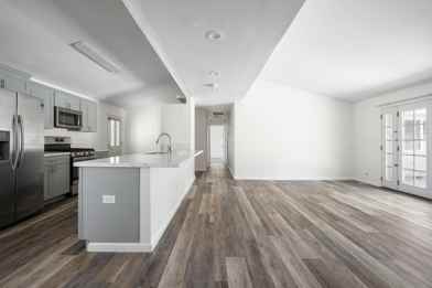 - Open kitchen with oversized peninsula opens to spacious living and dining room