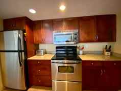 This apartment is specifically designed for longer term stays. There is lots of space, plenty of storage for clothes, and a well equipped kitchen for all your cooking.