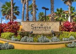 Beautiful turnkey furnished condo located in Serenata. This former model unit is located on the first floor and has three bedrooms, two bathrooms, laundry room, open floor plan and split bedrooms. The primary bedroom has a king sized bed, large walk in closet and an on suite bathroom with a tub/shower combination. The guest bedrooms each have queen sized beds and walk in closets. The guest bathroom has a tub/shower combination. The kitchen has a closet pantry, plenty of counter space for food prep and cooking and a breakfast bar. Separate living room/dining room combination. Screened in lanai looks out over a lake. Serenata has many amenities including gated security, heated community pool, tennis courts, 24 hour fitness center, clubhouse with billiard room, library and full kitchen, valet trash pickup as well as a car wash area for your convenience. No pets allowed. Will not last long.