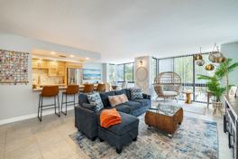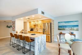 The condo also available fully furnished for $4500/m. Unit is available for a minimum of 3 months rental! Step inside this tastefully renovated, spacious 2 bedroom, 2 bath condo with water views in the sought-out area of Island Estates. As you enter, you are greeted by a stunning open concept kitchen with chic finishes, stainless steel appliances, and quartz countertops with a waterfall edge island. Beach ready with hard surface floors throughout to make cleaning a breeze. Additionally, the unit includes a covered parking space (#48) to protect your car year-round from the hot Florida sun! The in-unit laundry provides convenience for owners & renters. Water, sewer, trash, internet, cable, and pool & lawn maintenance are included.