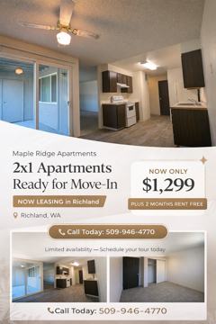 At Maple Ridge Apartments you will find spacious floor plans and superior amenities. Enjoy our park-like setting and the convenience of being minutes away from your daily destinations! We offer one, two, and three bedroom floor plans. Our property has two sparkling pools. We are located in Richland, near Lewis & Clark Grade School, Carmichael Middle School, and Richland High School with easy access to freeways. Please call for an appointment today.