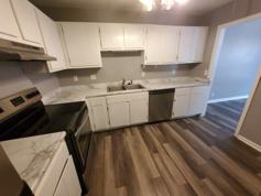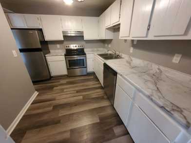 Renovated townhouse with 3 large BRs all with private bathrooms and large walk-in closets. Plus half bath on main floor for guests. Large living/dining area with vintage fireplace (no fires). Nice back deck off main floor and fenced patio with private entrance off lower BR. New LVP floors throughout entire unit (no carpet), SS appliances.